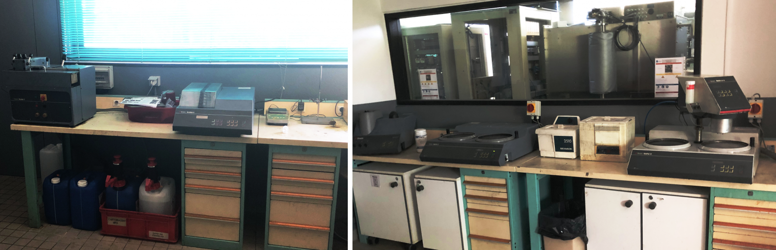 Macro-tronçonneuse : disque de 25 cm de diamètre, épaisseur 0,2 cm, la nature du disque ajustable, lubrification, Micro-tronçonneuse : disque de 15,2 cm de diamètre, épaisseur 300 ou 500 µm, nature du disque ajustable, lubrification, Polissage manuel, vitesse de rotation de 300 ou 150 tr/min, différentes gammes permettant d’aller jusqu’à un poli miroir (rugosité 1 µm), Polissage automatique : même propriétés que le polissage manuel, il y a la possibilité de faire 6 échantillons de diamètre 32 mm en même temps, Enrobage : à chaud (150 ou 180°C), résine conductrice ou pas, échantillon de taille 25 et 50 mm, force 0 à 50 kN Nom de l’outil : salle préparation des échantillons Fabricant : Struers Modèle : Discotom2 (macro-tronçonnneuse), Accutom-5 (micro-tronconneuse), Rotopol21 (Polissage), LaboPress3 (enroabge) Salle : LM026 plateforme SURFACE UTBM site de Montbéliard |