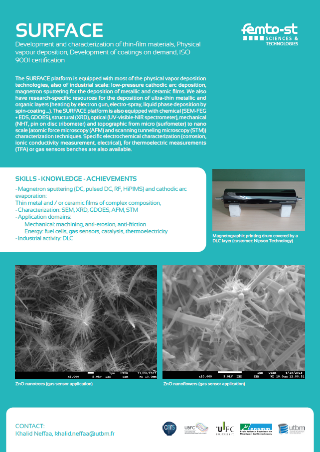 The platform SURFACE possesses unique mean of elaboration and characterization on thin layer. It reassembles fifteen specialist of those domain and an experimental parc estimated at 6 million of euro. For the elaboration part, SURFACE has physical deposition in vapor phase reactors (industrial and architectural reactors) as well as surface structures at micro and nanometric scales. It also has mean of deposit in liquid phase and under ultra-vacuum by thermic evaporation and electrospray.