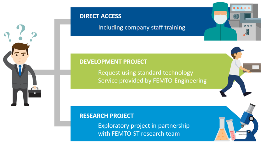 Within the framework of the French technological centers opening (Renatech network), the FEMTO-ST Institute is committed to support at MIMENTO projects from external laboratories or from industrial partners for research collaboration. Each request will be examined by a local committee and will lead to a discussion with the technical staff to check the feasibility of the project, its cost and the fabrication time. Depending on the technological project, external people will be invited to perform themselves some technological steps in the cleanroom.