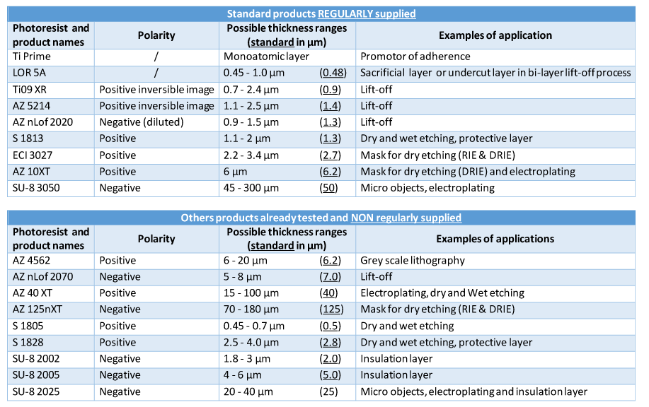 Depending on the process, the most suitable resist is chosen; we will mainly take into account its chemical properties, its polarity and its thickness. In addition, there are permanent resists used as end products to fabricate micro-components