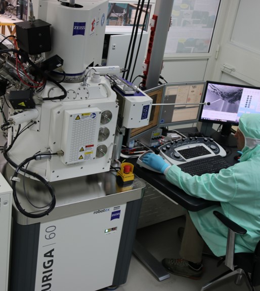 -La station se compose d’un MEB Auriga 60 de Zeiss, d’un FIB Orsay physics et d’un injecteur de gaz Oxford Instrument  équipé de 3 ligne de gaz, XeF2, cyclopentadiényl platine, et naphtalène.